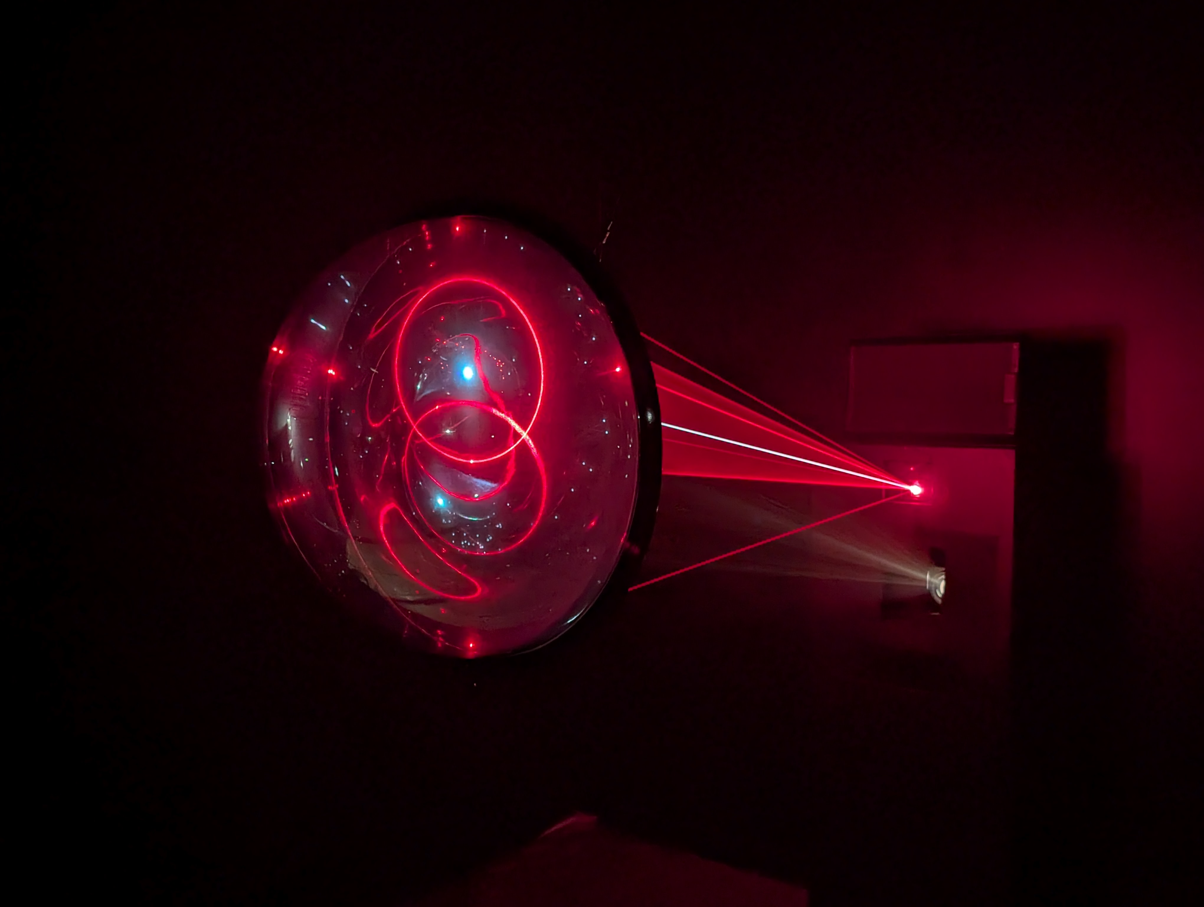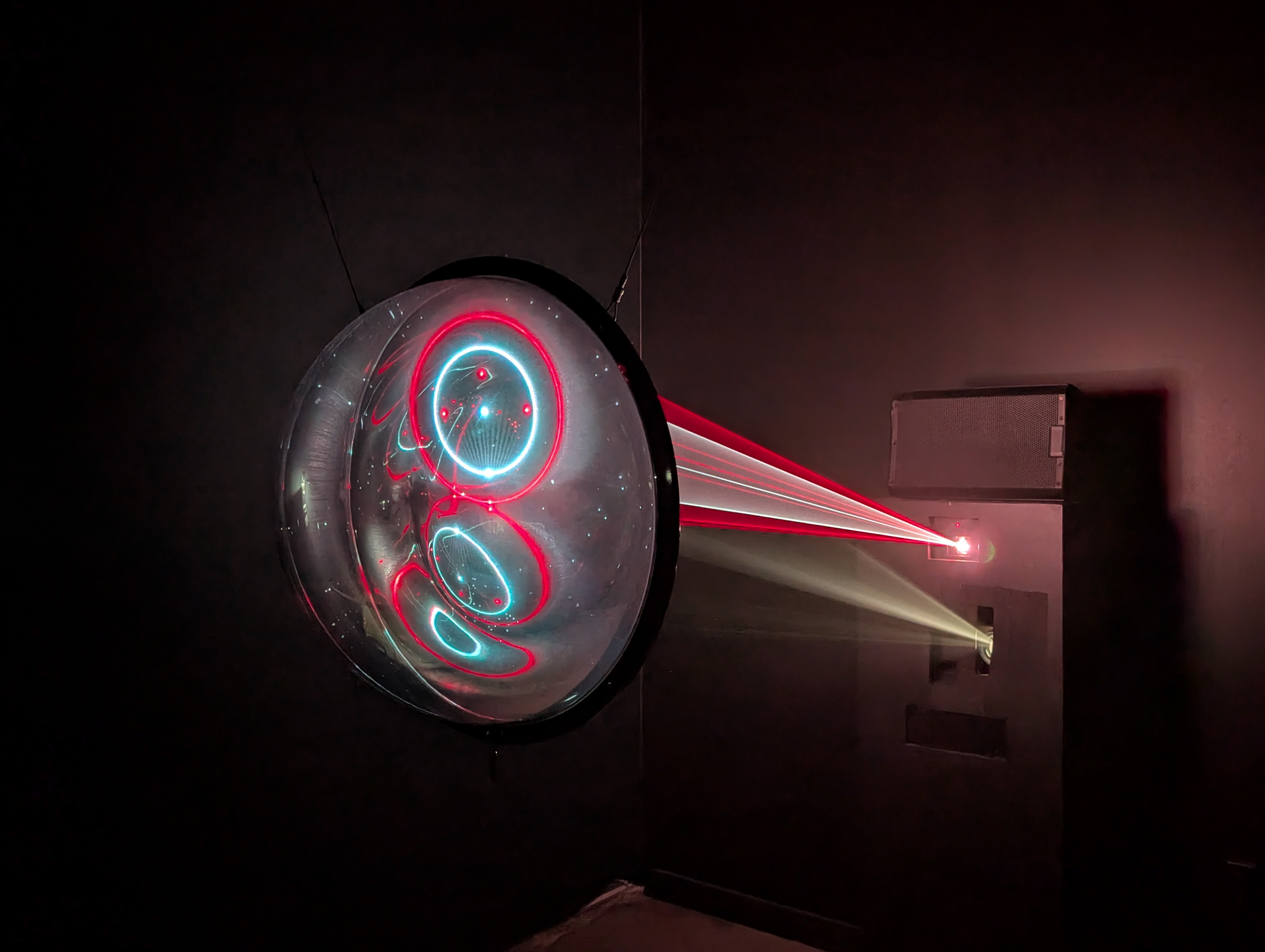 A very different laser-based piece looks like a mutant cathode ray tube, with lasers projected from the back at a non-uniform, semi-transparent piece of something that turns them into patterns. I'm not sure what exactly the "something" is made out of; it's described as simply "a hemispherical sculpture". It's slightly unnerving when viewed from the front, since the lasers are pointed more or less directly at your face (but they don't make it through the "hemispherical sculpture").