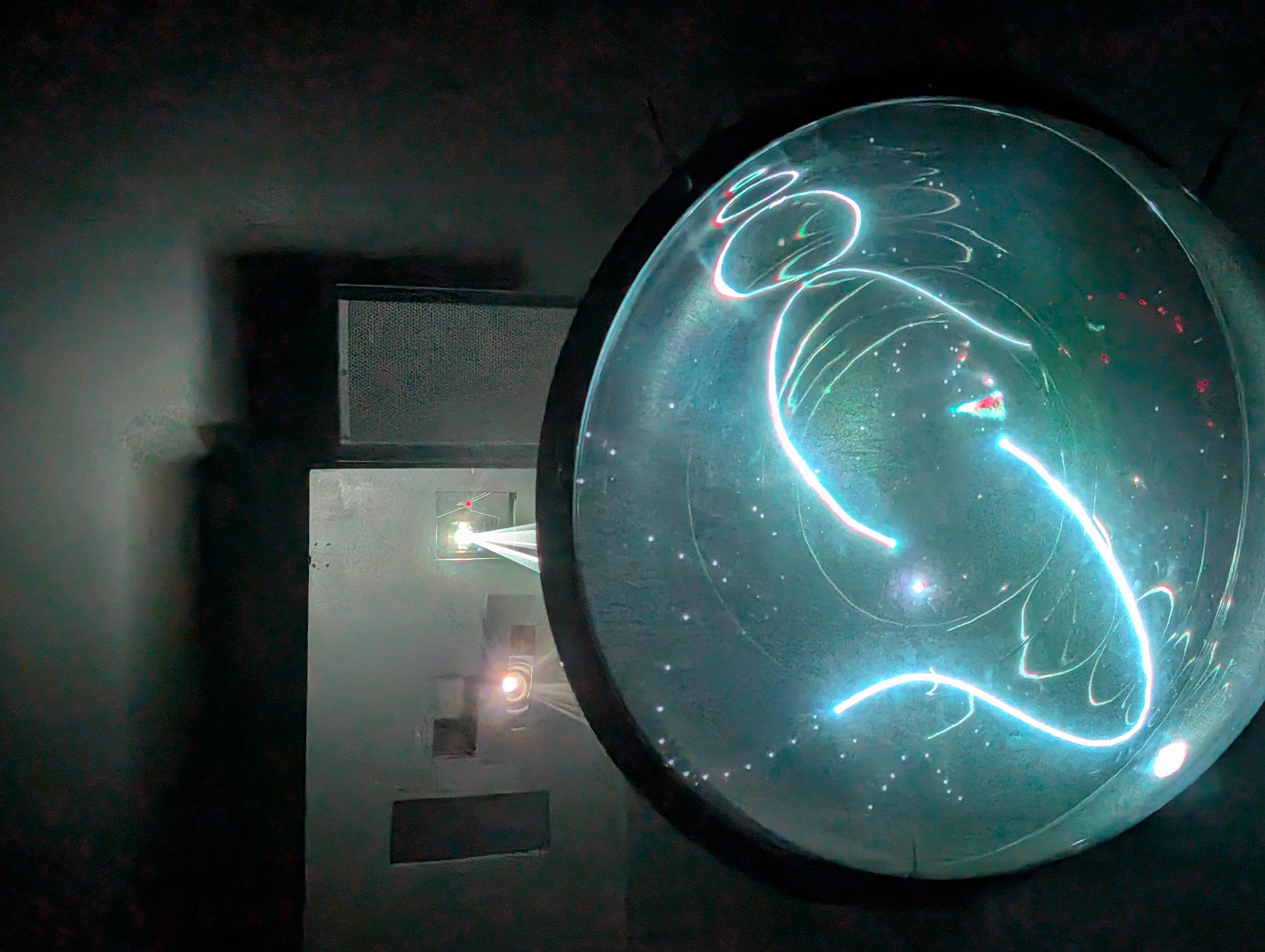 And this one, data subsidence (2022), has lasers "drawing" on a circular board covered in phosphorescent paint: