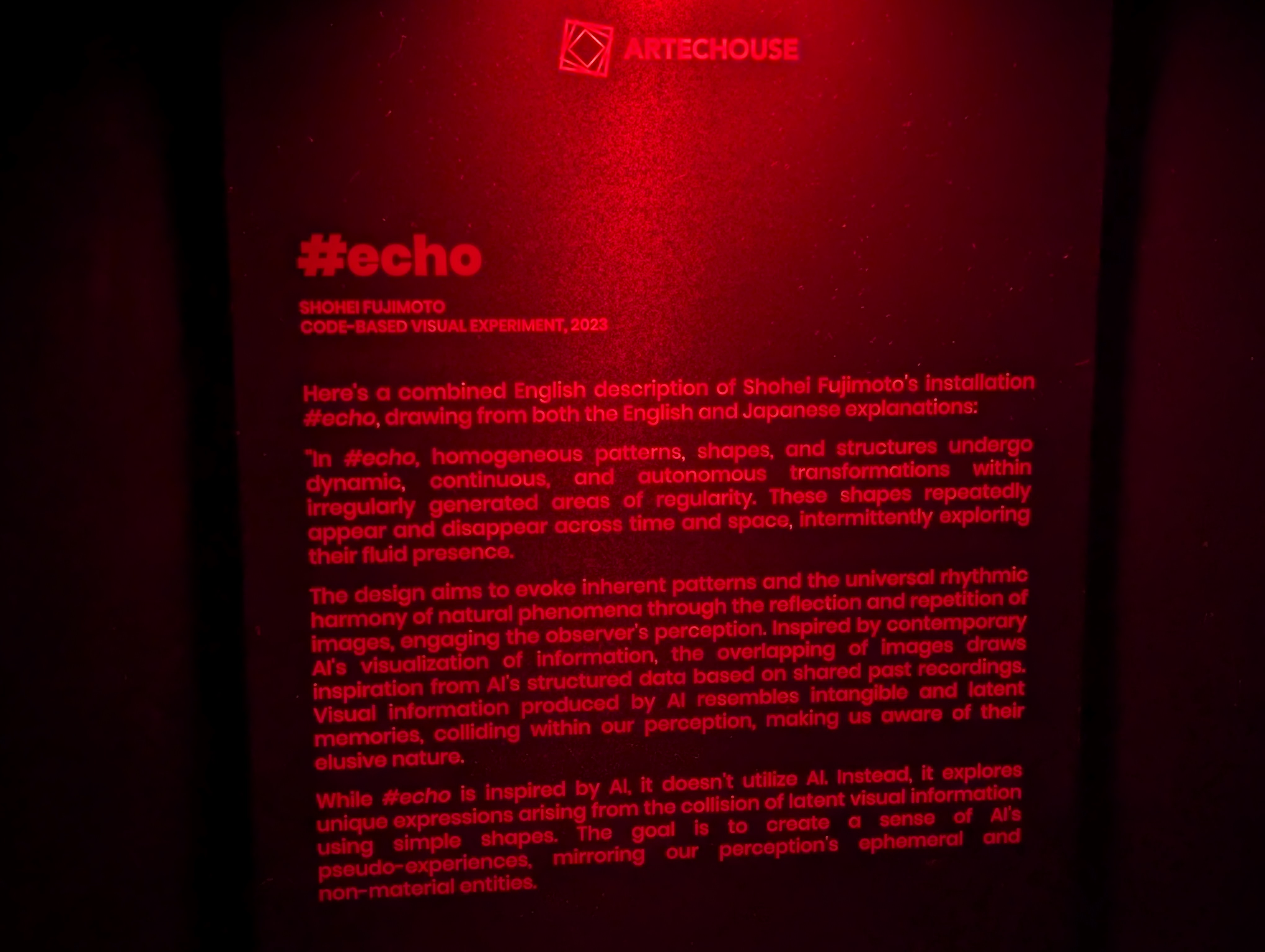 I believe this is a quasi-permanent (?) exhibition that opened in June 2024 with the opening of Artechouse Houston, and shows alongside whatever rotating exhibit they have. Some of the pieces were previously shown at the same-titled 2020 exhibition at Artechouse NYC and/or 2023 exhibition at Artechouse DC, while others are new.